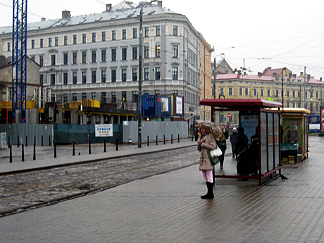 И еще важный метеорологический штрих - в Риге сегодня идет дождь, и почти все прохожие вооружены зонтиками. Панорама трамвайной остановки перед Старым городом.